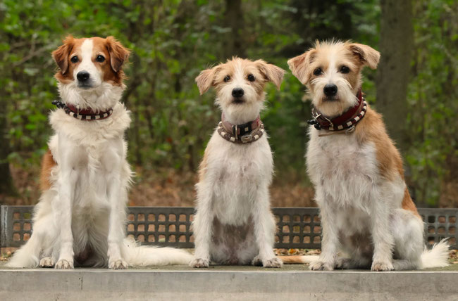 Anouk und Andra sind reinrassige Kromfohrländer in der Haarvariante glatt-lang und Delta ist ein reinrassiger Kromfohrländer in der Haarvariante rau mit Bart.